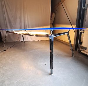 De tafel is uitgevoerd met een luxe acrylaat blad in de kleur Ocean Blue, wat zorgt voor een moderne, lichtdoorlatende uitstraling. De geïntegreerde verlichting van Luceplan in het verchroomde aluminium frame geeft een subtiel en professioneel lichteffect, ideaal voor representatieve ruimtes.